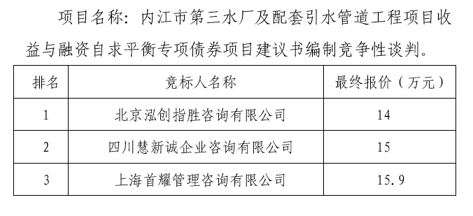 內(nèi)江市第三水廠及配套引水管道工程項目收益與融資自求平衡專項債券項目建議書編制談判結(jié)果公示