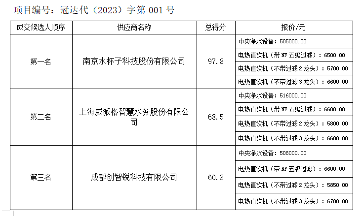 內(nèi)江市水務(wù)有限責(zé)任公司內(nèi)江高級(jí)技工學(xué)校管道直飲水成套設(shè)備及附件采購(gòu)(含安裝)項(xiàng)目競(jìng)爭(zhēng)性磋商結(jié)果公示