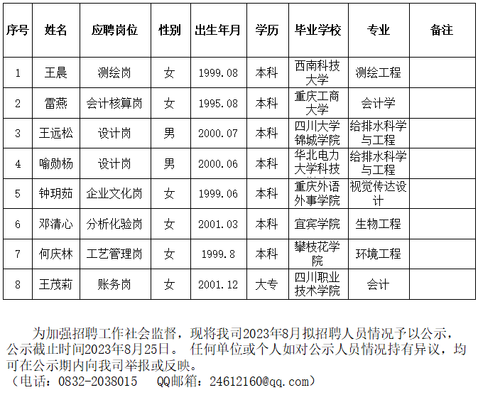 內江市水務有限責任公司2023年8月擬招聘人員公示