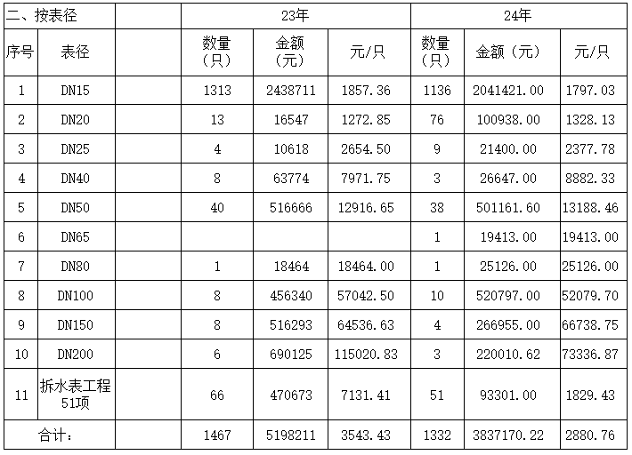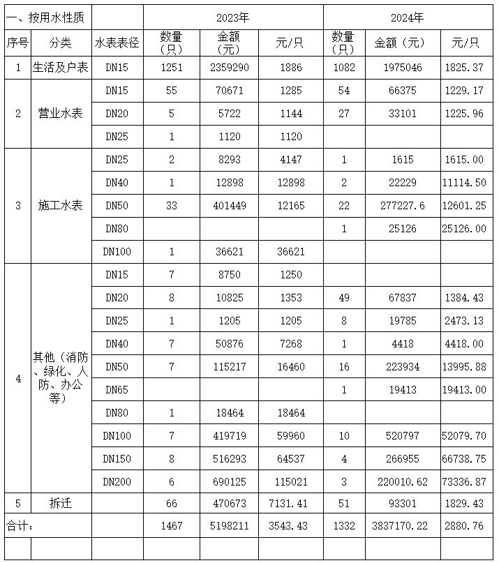 內江市水務有限責任公司2023-2024供水安裝平均價格公示