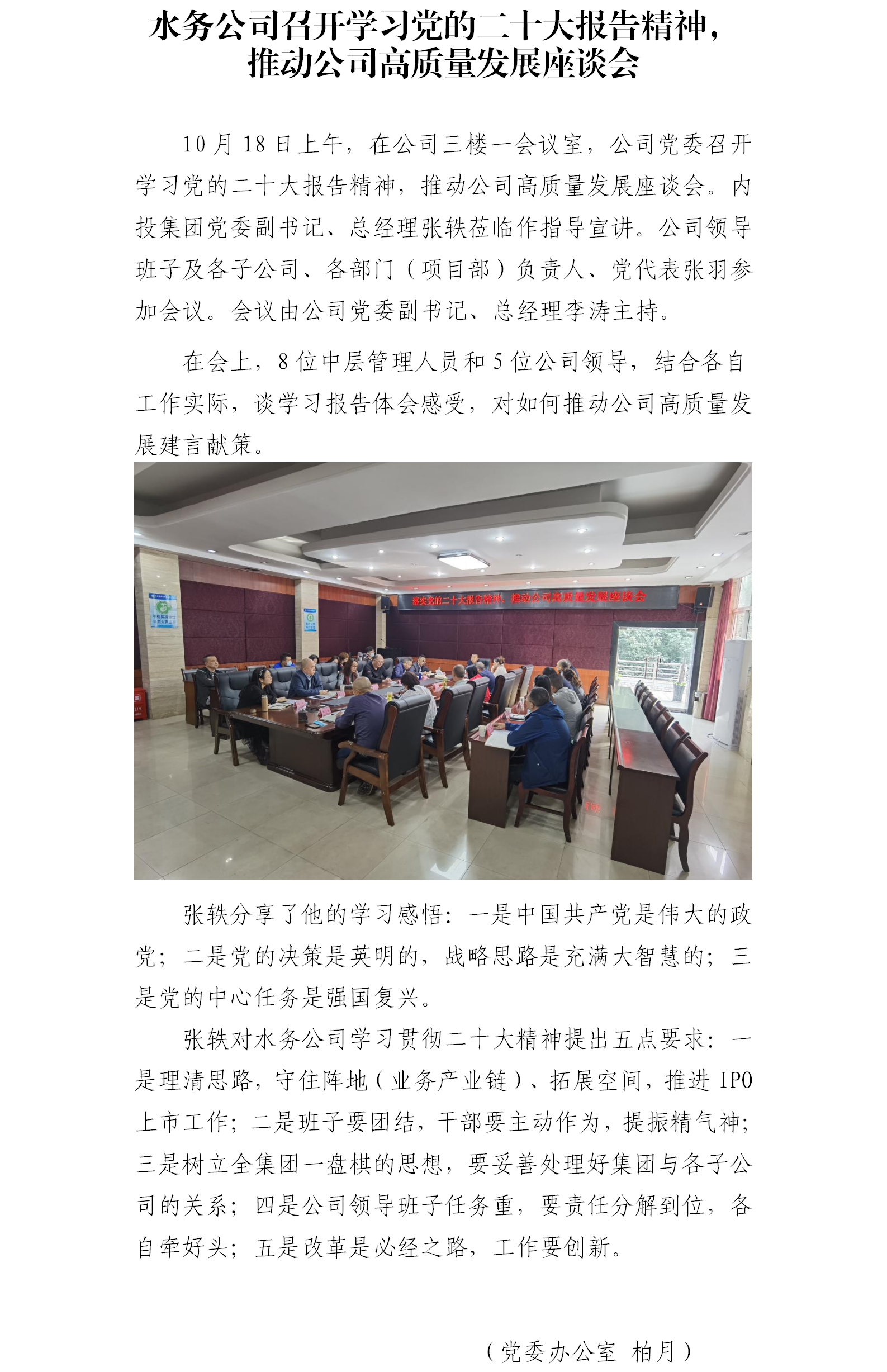 水務(wù)公司召開學(xué)習(xí)黨的二十大報(bào)告精神, 推動(dòng)公司高質(zhì)量發(fā)展座談會(huì)