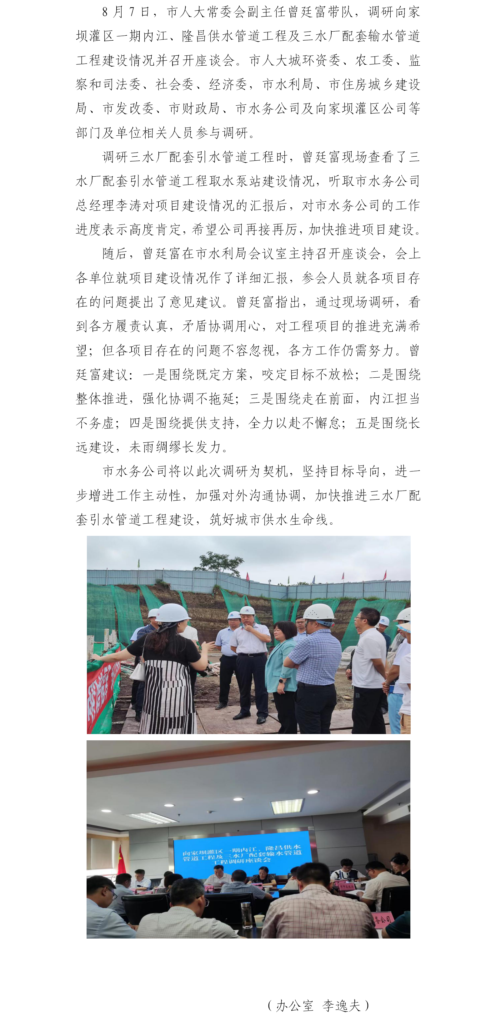 市人大常委會(huì)調(diào)研向家壩灌區(qū)一期內(nèi)江、隆昌供水管道工程及三水廠配套引水管道工程