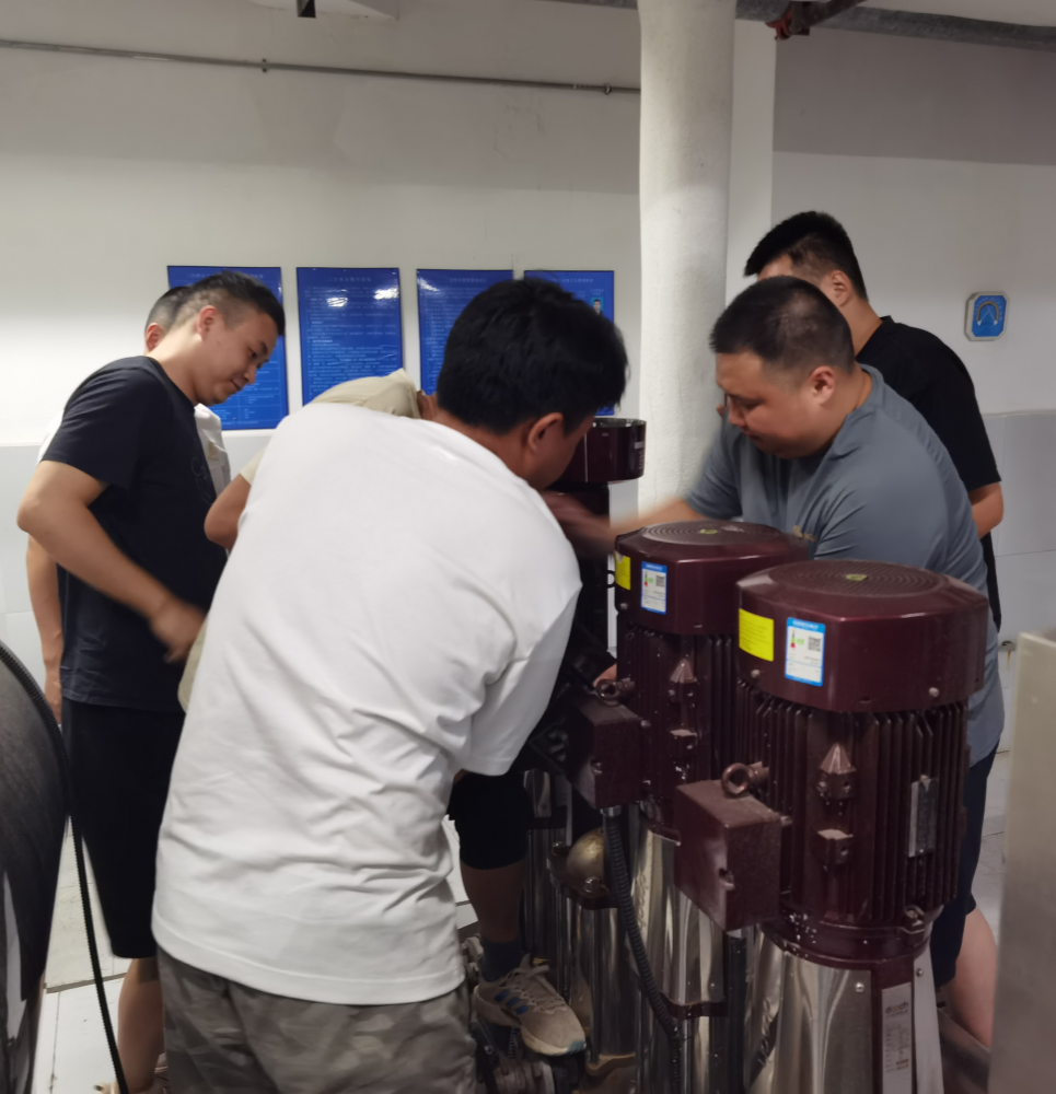 6月中旬,該小區有用戶反映水壓不穩定。豪鵬二次供水公司收到信息立即組織人員前往現場排查,確認是一臺水泵電機出了故障,引發電壓波動所致。面對突發情況,公司迅速響應,立即組織人員對故障電機進行拆解維修。6月17日下午,維修工作進入電機重新安裝的關鍵階段,公司抓住這次實戰機會,組織5名青年員工參與到此次技術練兵。通過此次培訓,員工們不僅掌握了電機維修與安裝的相關理論和維護技巧,更在實戰中深化了對二次供水設施運行原理的理解。